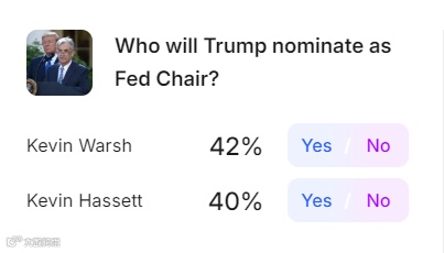 (1)新任美联储主席候选人:突发逆转,哈塞特概率【40%】,沃勒概率【42%】。