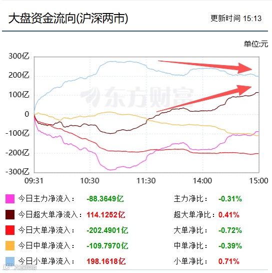 (2)A股盘面:A股续创13连阳纪录,离4100点一步之遥,主力净流出88.4亿,盘尾散户离场、机构加仓,初现分歧,两市成交2.8万亿,成交量能放大10%,量能全面达到2025年9月水平。