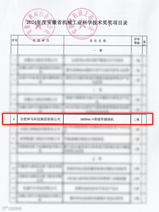 2024年度安徽省机械工业科学技术奖获奖项目公布,合肥神马自主研发的“1800mm/4增强带缠绕机”荣获二等奖。
