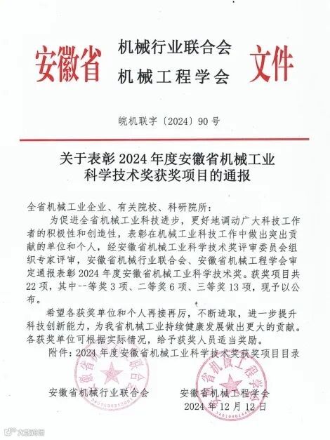 荣获安徽省机械工业科学技术奖二等奖