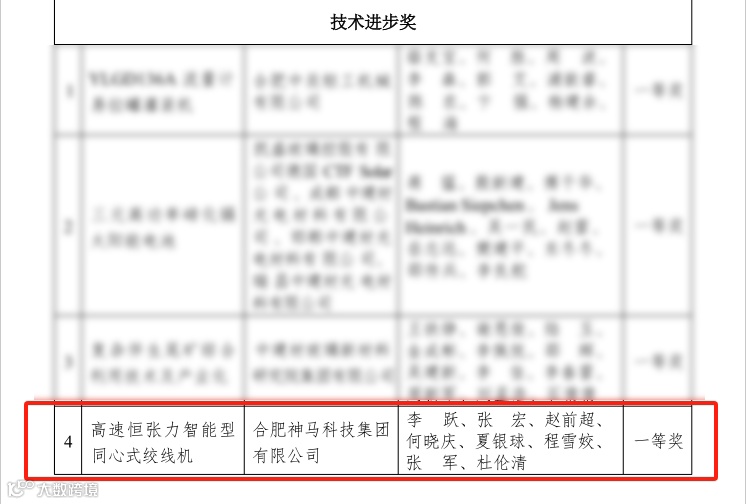 近期,2024年度凯盛科技集团有限公司科学技术奖和技术革新奖评审结果公示,合肥神马自主研发的“高速恒张力智能型同心式绞线机”获评科学技术奖技术进步奖一等奖。
