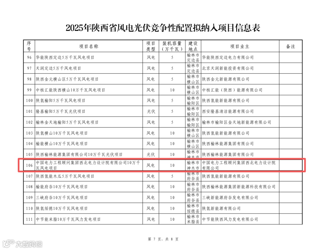 2025年12月31日,陕西省发展和改革委员会发布《关于公布2025年新能源项目保障性并网规模竞争性配置结果的通知》,西北院申报的“中电工程西北院神木市10万千瓦风电项目”凭借综合技术优势与成熟开发方案,顺利入围公示名单。该项目将与西北院2023年在同一区域获得的10万千瓦光伏项目协同,共同打造总装机容量20万千瓦的“风光互补”清洁能源基地,进一步提升企业在区域新能源领域的整体运营能力。