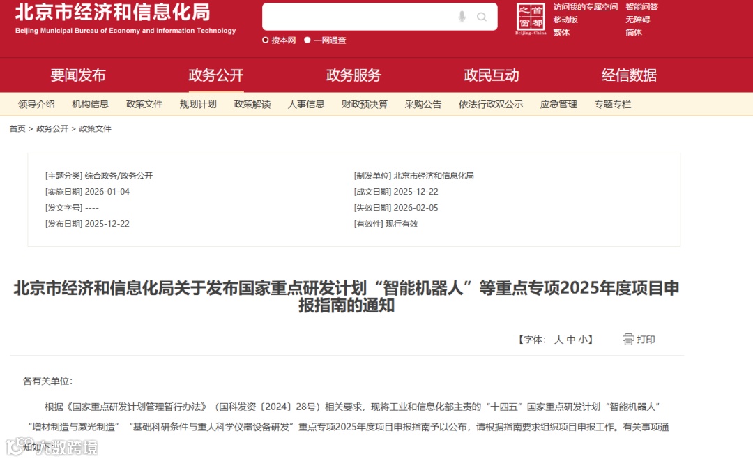 3、北京市经济和信息化局关于发布国家重点研发计划“智能机器人”等重点专项2025年度项目申报指南的通知