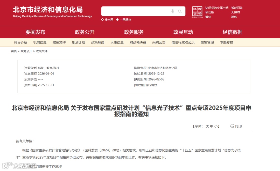 4、北京市经济和信息化局 关于发布国家重点研发计划“信息光子技术”重点专项2025年度项目申报指南的通知
