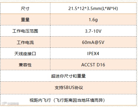 2.4G频段,小尺寸,适用于穿越机,出厂默认为ACCST D16 V2版本。