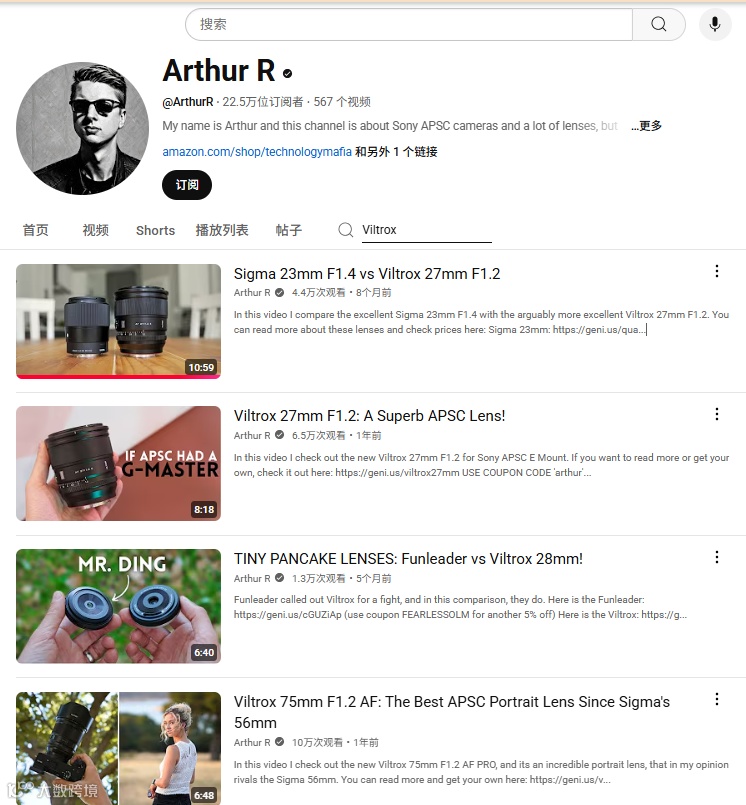 Arthur R通过对比评测(如将Viltrox与Sigma、Funleader镜头对比)直观展现其光学性能与性价比,结合“Superb”“Best”等强烈用词强化产品优势;针对索尼APS-C用户精准定位,突出镜头适配性与轻量化设计,并通过单品深度解析(如75mm F1.2媲美Sigma 56mm)建立专业信任。