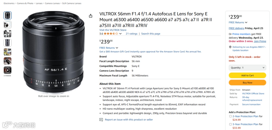 以索尼E卡口的56mm F1.4镜头为例,适马售价564.95美元,而唯卓仕仅239美元,差价达57%。