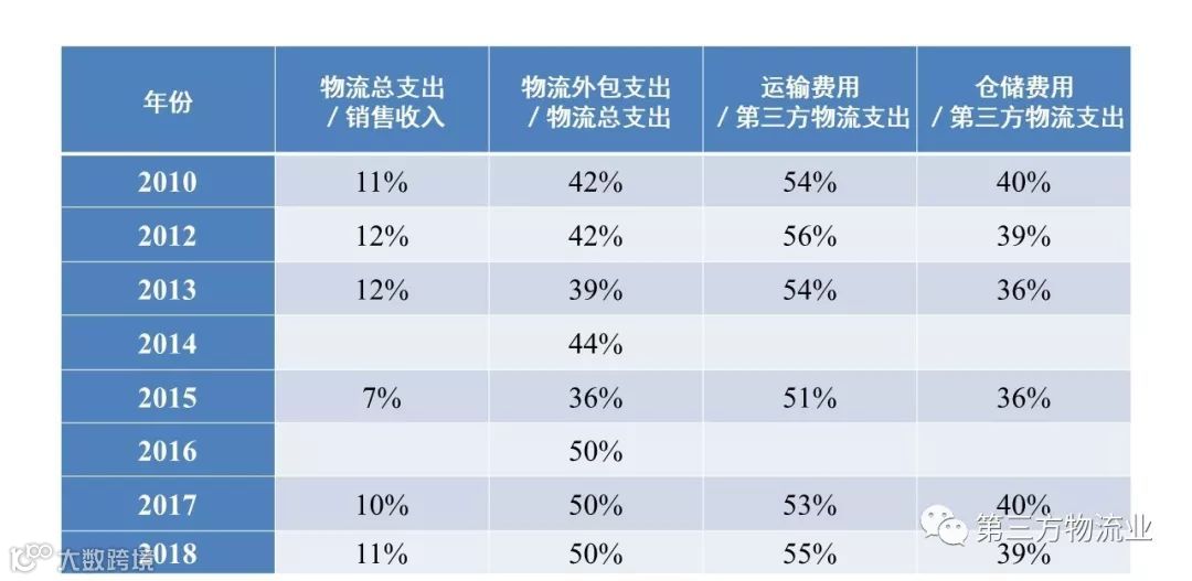 第三方物流作为现代物流的一部分,其发展得益于物流外包比例的增长。下图展示了物流外包支出占物流总支出的比例: