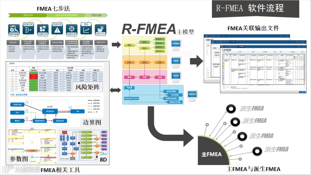 与传统的FMEA分析方法和软件相比,R-FMEA最大的特点是通过其七步的分析流程, 构建了关联紧密的FMEA基础数据关系,即FMEA主模型。FMEA主模型体现了类三维模型概念,既包括了结构之间、功能之间、失效之间的关联关系, 又包括了结构、功能、失效、措施、风险值(S、O、D)之间的关联关系。这些关联关系在分析过程中逐步创建,并保存于底层数据库中。通过FMEA主模型,工程人员可以根据需要构建简单的或者及其复杂的FMEA分析, 并实现企业知识的积累和快速重用。