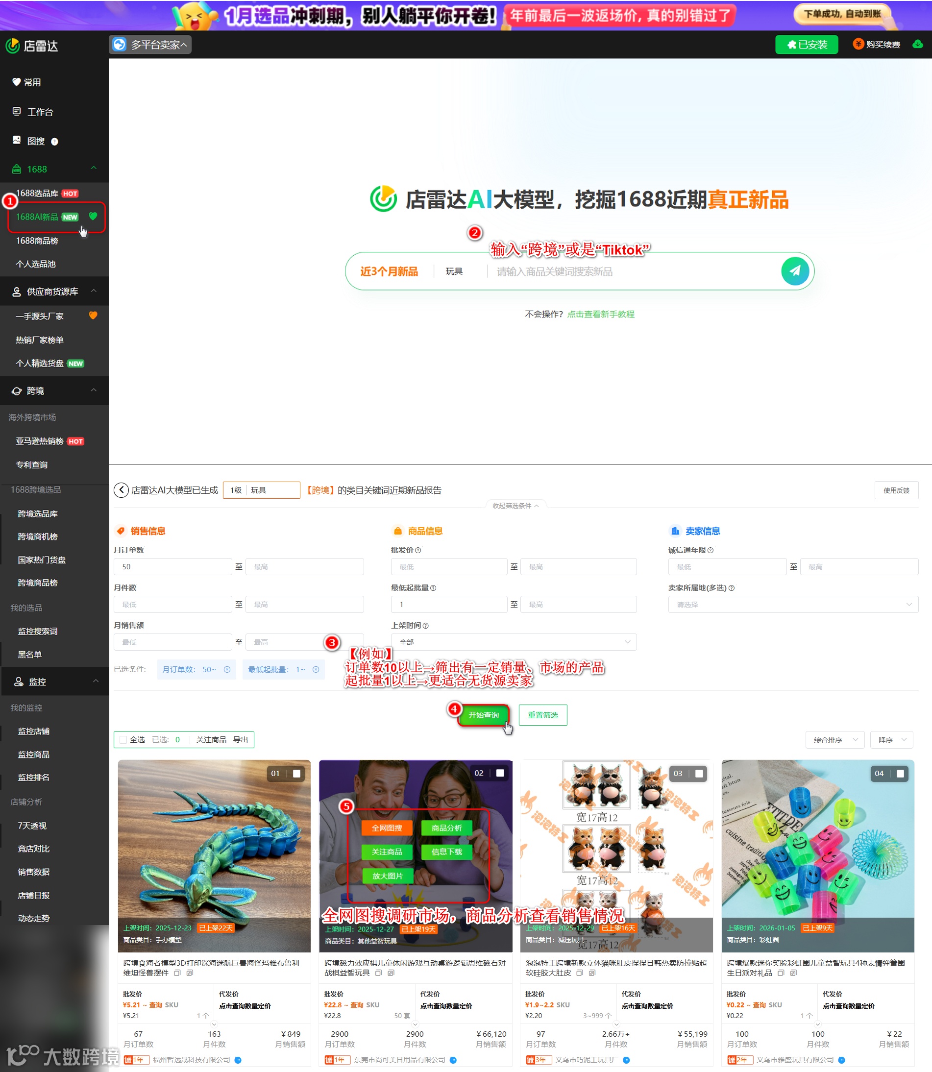 选品时,可借助 1688 AI 新品功能筛选平台新品: