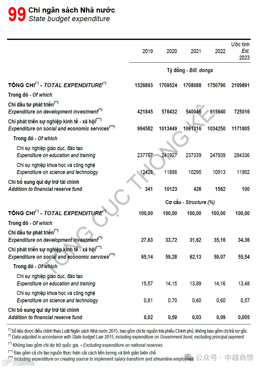 - 发展投资支出由421,845亿越南盾增至725,016亿越南盾,占比在2023年达34.36%。