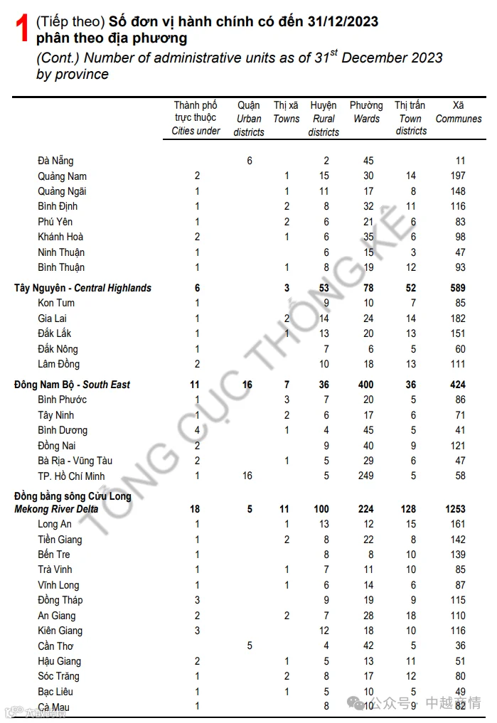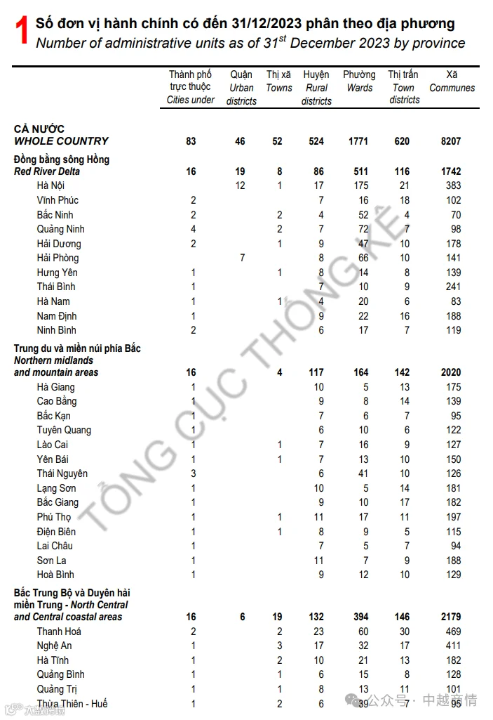 - 全国范围:截至2023年底,越南共设有83个城市、524个农村区、1771个坊、620个镇和8207个乡。