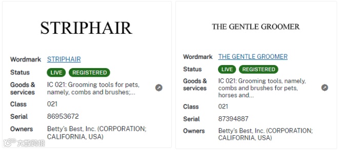 文字商标StripHair和The Gentle Groomer注册在21类宠物美容工具梳子和刷子等类目: