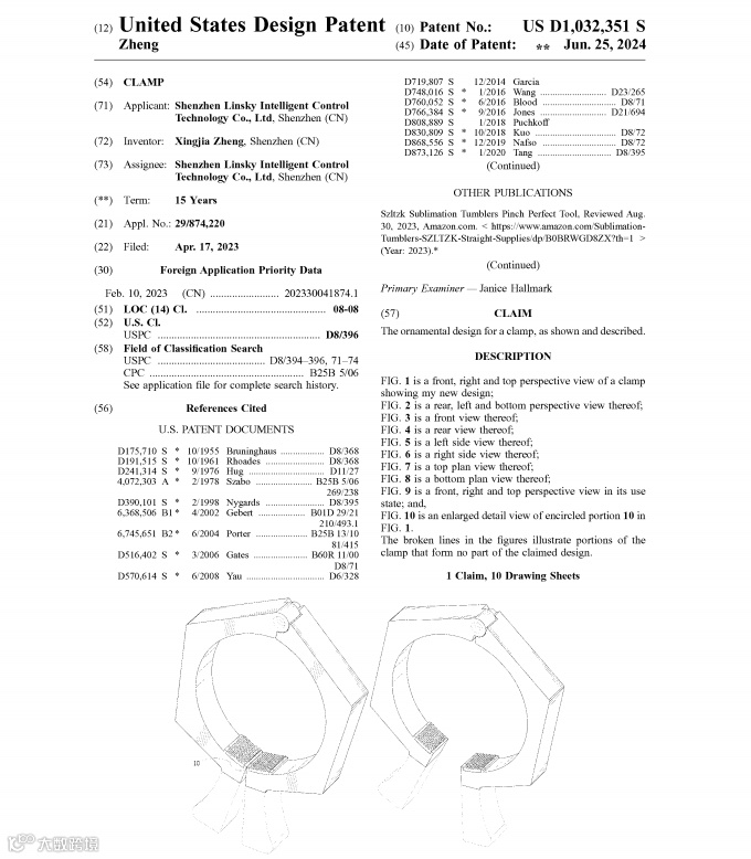 专利名称Clamp,专利号USD1032351S,2023年4月17日提交申请,2024年6月25日下证: