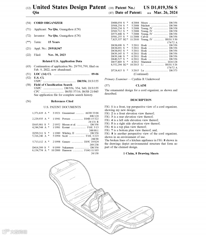 专利名称Cord organizer,专利号USD1019356S,2023年11月30日提交申请,2024年3月26日下证: