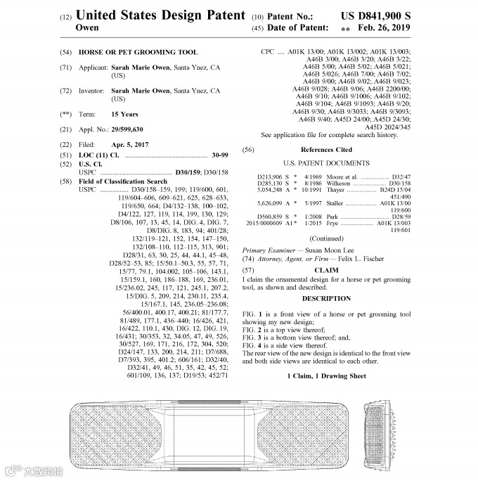 产品的美国外观专利早在2019年2月份就已获得授权,专利名称Horse or pet grooming tool,专利号USD841900S: