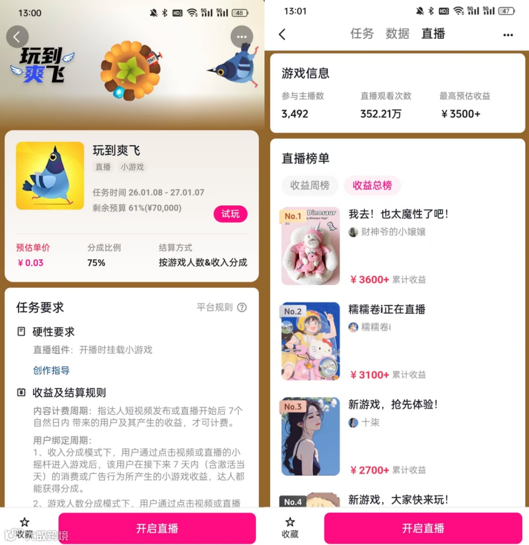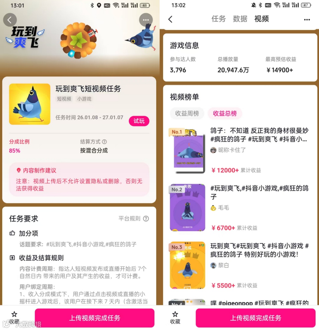 与此同时,该游戏1月8日在抖音发行人计划中发布的视频与直播任务,吸引数千名创作者参与,带动视频观看量超2亿,直播观看人次也超300万。凭借“魔性鸽子”的热梗效应,话题发酵传播还在持续,已形成了“游戏内容+达人传播”的高效裂变闭环。