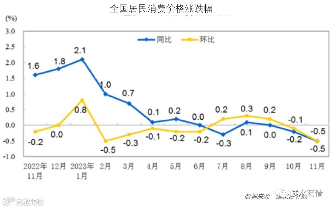- 2023年11月,全国居民消费价格同比下降0.5%,食品价格下降4.2%。