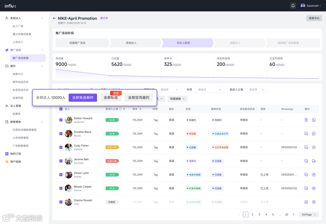 采用邮件、私信、定向邀约等方式批量触达目标达人,提升建联成功率。支持消息统一管理,实时同步TikTok后台通信,避免平台切换。针对“已读未回”高潜力达人,可一键发起自动多轮触达,持续提升响应率。