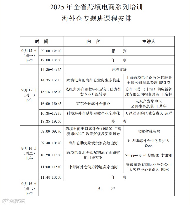 为提升企业跨境出海能力,推动海外仓高质量发展,安徽省商务厅将于2025年9月15日至16日在芜湖市举办全省跨境电商海外仓建设与应用专题培训。