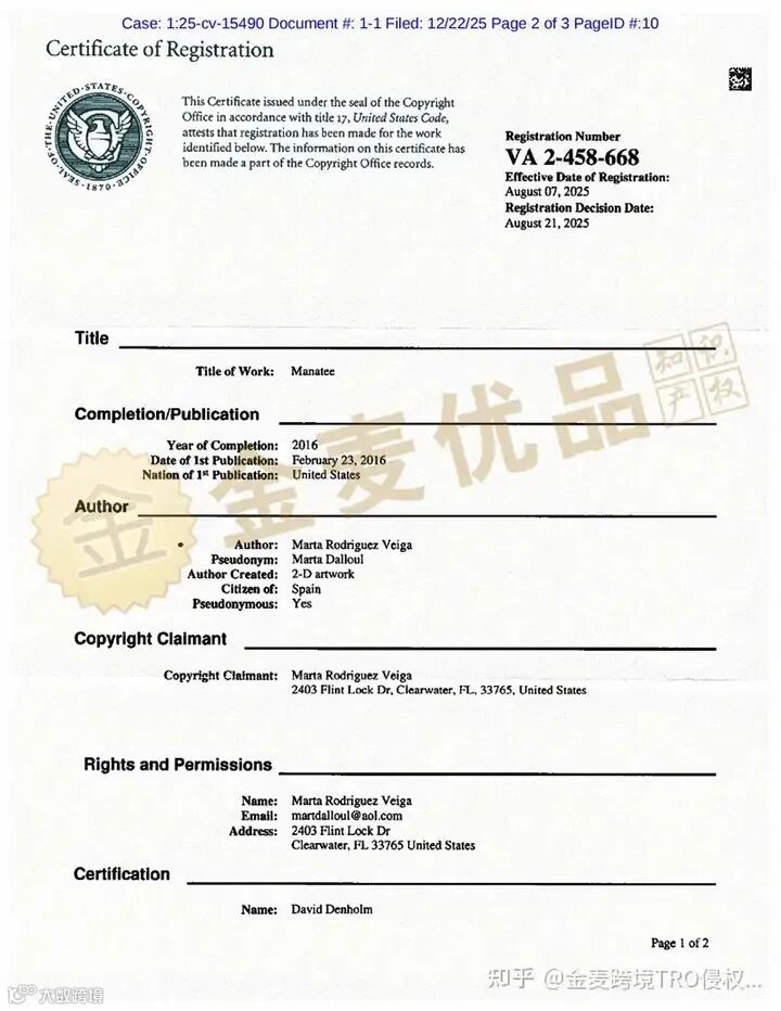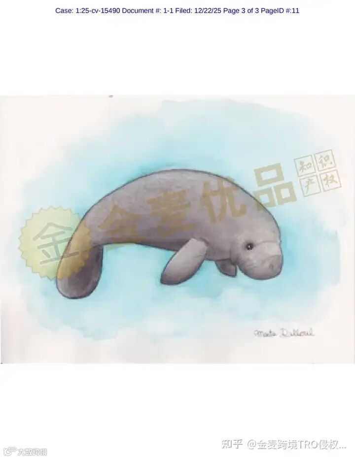 Marta Rodriguez Veiga于2025年8月7日获得美国版权认证的海牛作品,版权号为:VA 2 - 458 - 668,此作品被广泛用于礼品、抱枕以及家居装饰等多个热门领域,未经授权使用,则会面临侵权风险。目前该案件处于前期阶段,但卖家们绝不能掉以轻心,必须尽快采取行动,排查并下架高危链接。