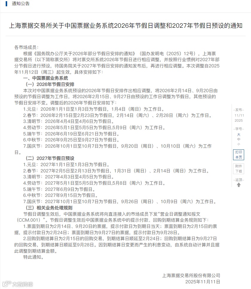 上海票据交易所关于中国票据业务系统2026年节假日调整和2027年节假日预设的通知