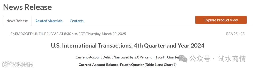 2025年3月20日,美国经济分析局(BEA)发布了《2024年第四季度及全年国际收支报告》。这份报告详细统计了美国与其他国家之间的资金流动情况,是观察美国经济对外依赖程度、出口形势以及国际投资变化的重要参考。