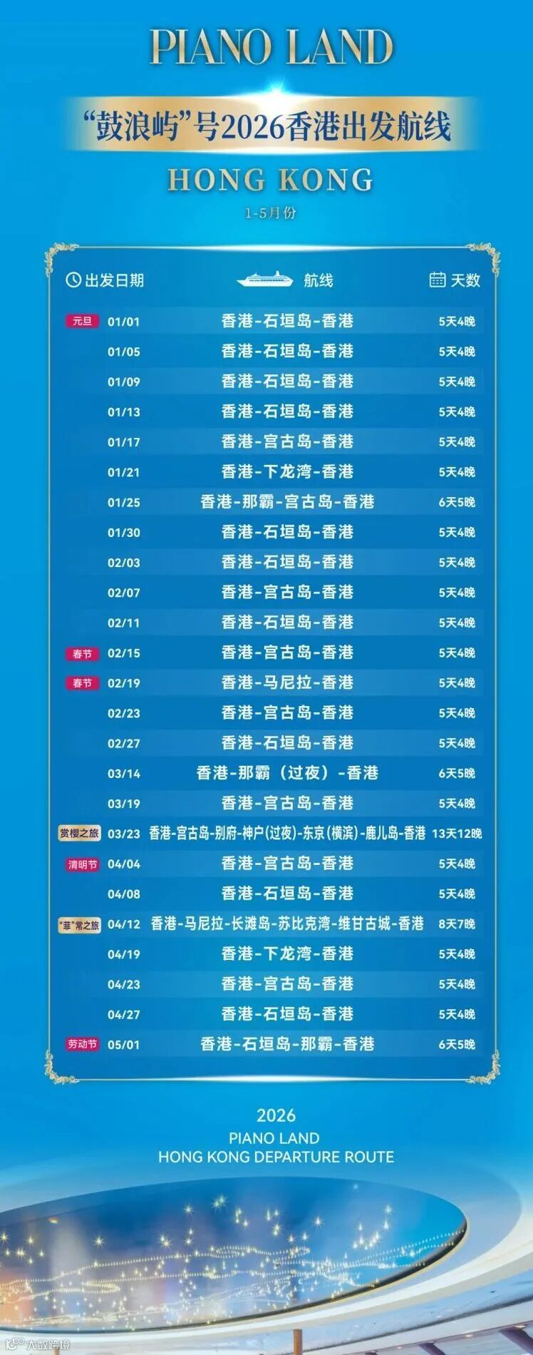 2.假期专属航线密集:元旦、春节、清明、劳动节等重要假期均有定制航次,海上过节仪式感满满,不用请假拼假。