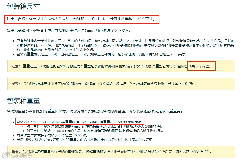 外箱除需粘贴2–3张标准FBA标签外,在特定重量条件下还需加贴超重标识: