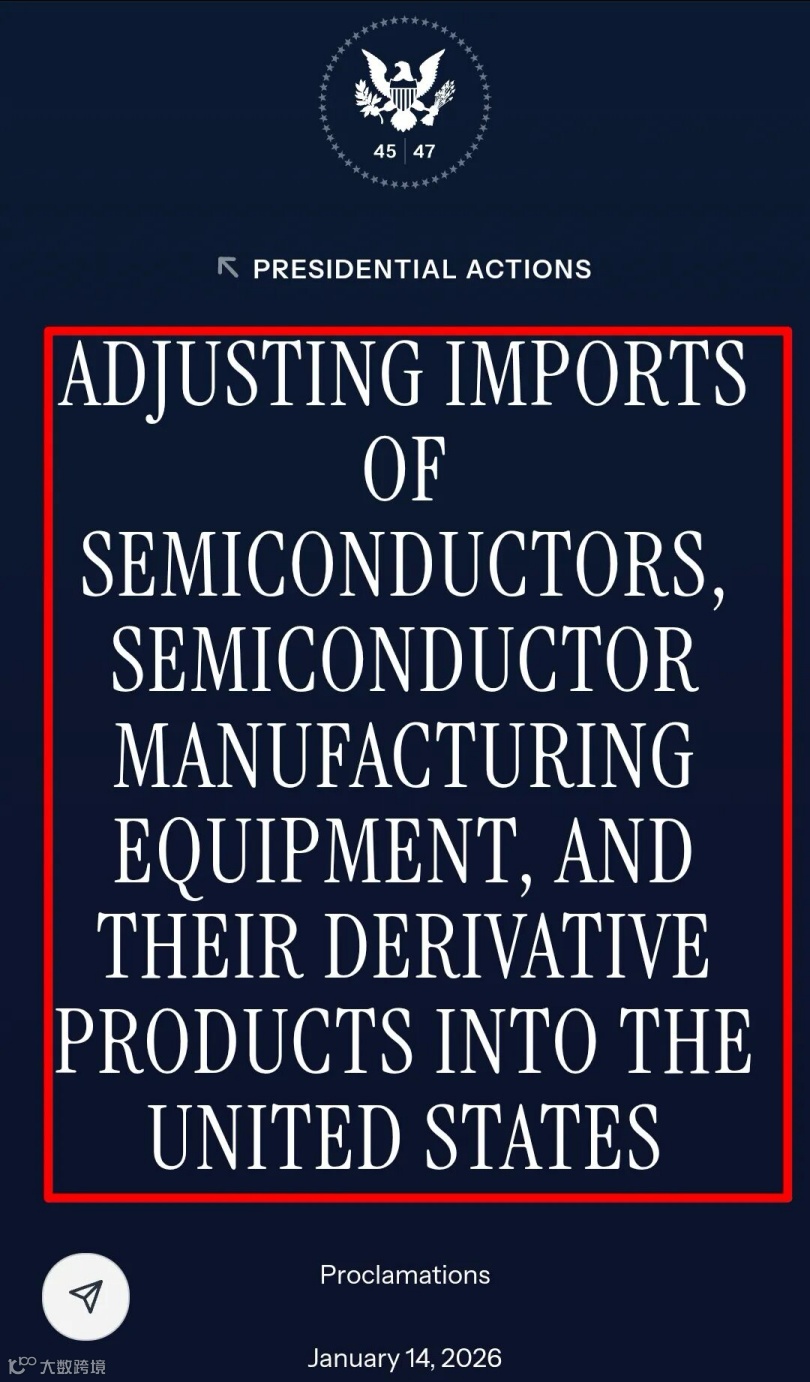 据央视新闻及白宫官方消息,当地时间1月14日,美国政府宣布,自1月15日起,对部分进口半导体、半导体制造设备及其衍生品加征25%的进口从价关税。该措施由美国总统特朗普签署行政命令生效,主要基于国家安全及关键技术供应链考量。