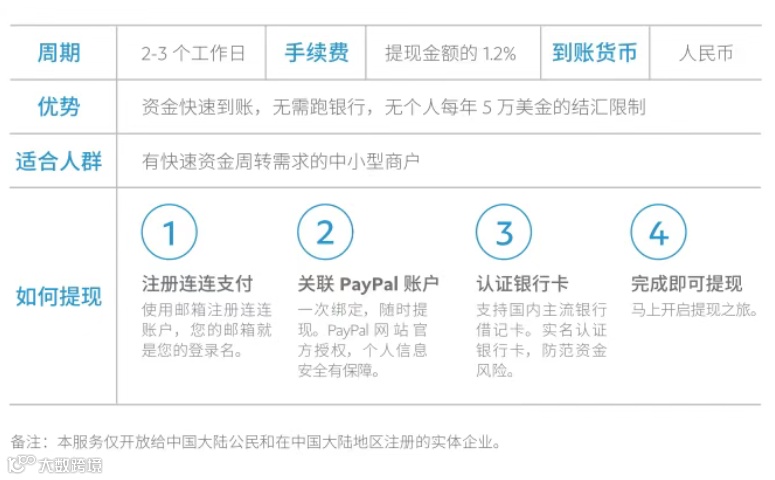 支持将款项提现至中国大陆、香港、美国等地的银行账户,也可通过支票提现。具体路径与手续费请参考PayPal官方说明。