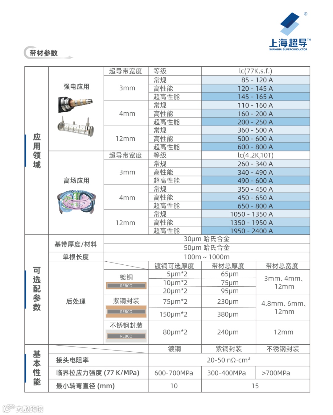 下图:上海超导第二代高温超导带材产品规格