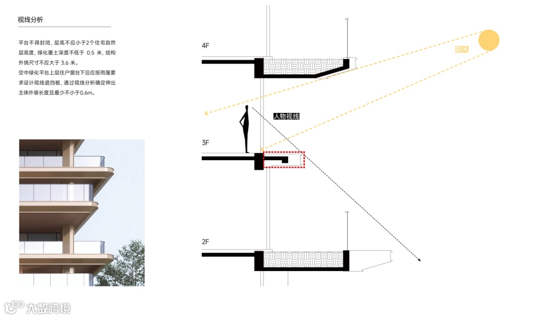 空中绿化平台按照奇偶层进行错位布置,优先设置为一层呈南向布局,一层呈东西向布局,以此减少各平台之间的视线干扰。在同一楼层中,相邻平台之间采用功能性隔断挡板;在上下楼层之间,设置水平挡板,从而实现视线隔离,避免隐私泄露。