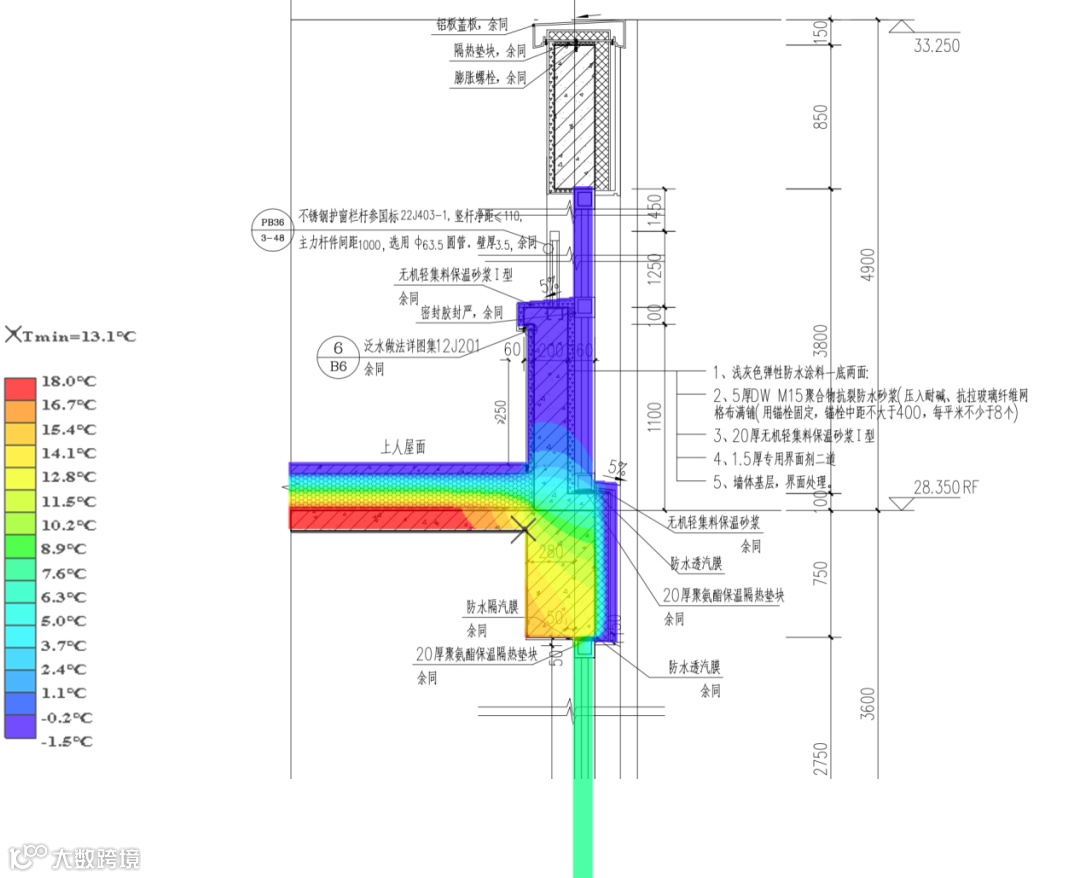 建筑中存在一些特殊复杂节点,例如檐口部位、架空楼板及设备平台部位等,构造较复杂,通过软件模拟分析节点,验算内表面温度满足设计要求。