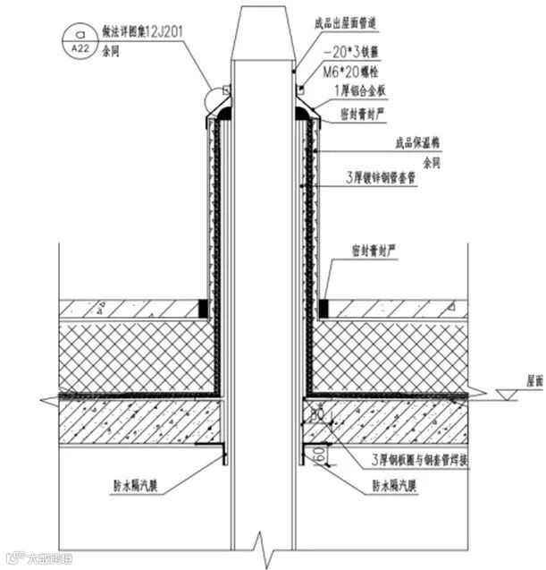 出屋面管道预留洞口大于管道外径100mm,设置套管进行保护,套管与管道之间填充成品保温棉,填充至管道顶。