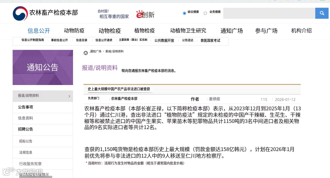 近日,韩国动植物检疫局(APQA)通报一起重大农产品走私案,为近年来规模最大的非法进口案件。12名涉案人员在13个月内累计走私1150吨中国农产品,平均每月约10个集装箱,黑市估值达158亿韩元。