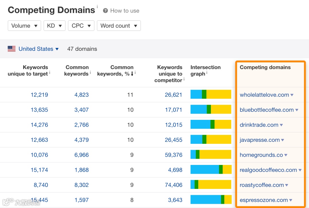 如果你觉得这些关键词还不够,还需要更多的关键词,那你就找到一个竞争对手的域名,通过 Competing Domains(竞争域名)报告中找到更多竞争对手(输入一个竞争对手的域名,他就会帮你找到一大堆竞争对手。)