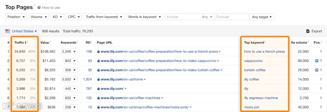 比如,你把竞争对手的网址输入到 Ahrefs 的网站分析里面去,就可以看到 Top Pages(热门页面)报告,这里会显示他们获得流量最多的页面。同时它还会展示出这些页面获得流量最多的关键词是什么。