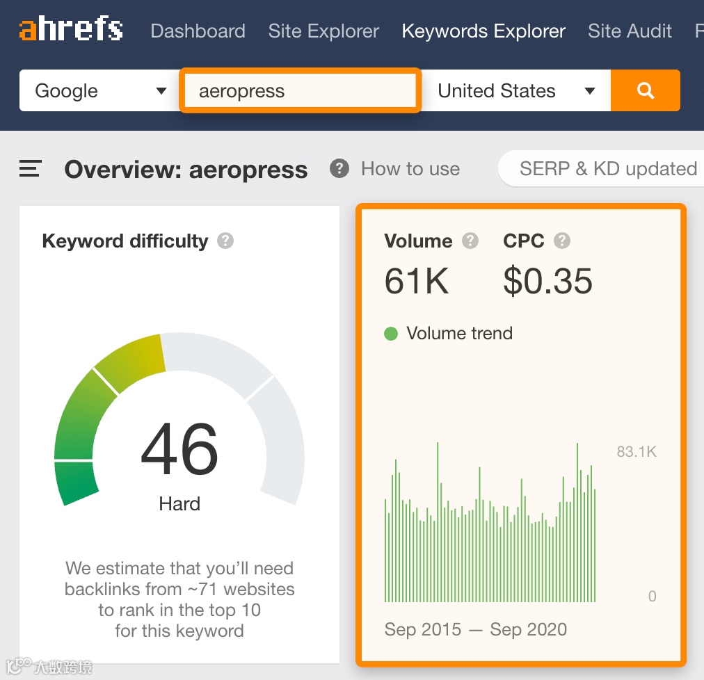 此人在询问有关名为 Aeropress 的咖啡机的问题。 如果我们将该词放入Keywords Explorer(关键词分析)中,则会发现该词在美国平均每月有61,000次搜索。