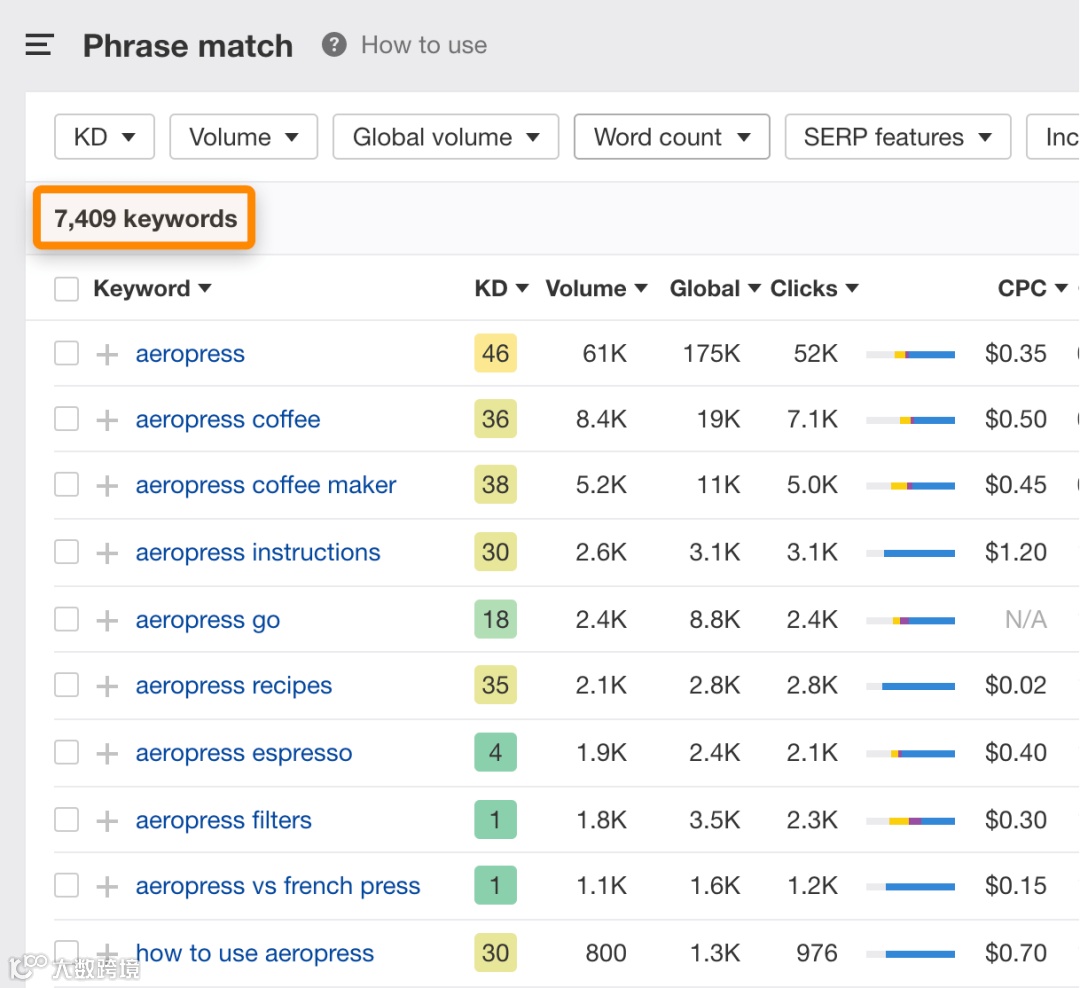 例如,如果我们使用 「aeropress」作为种子关键词,然后筛选条件选「Phrase match(部分匹配)」,就可以看到成千上千个关键词建议。