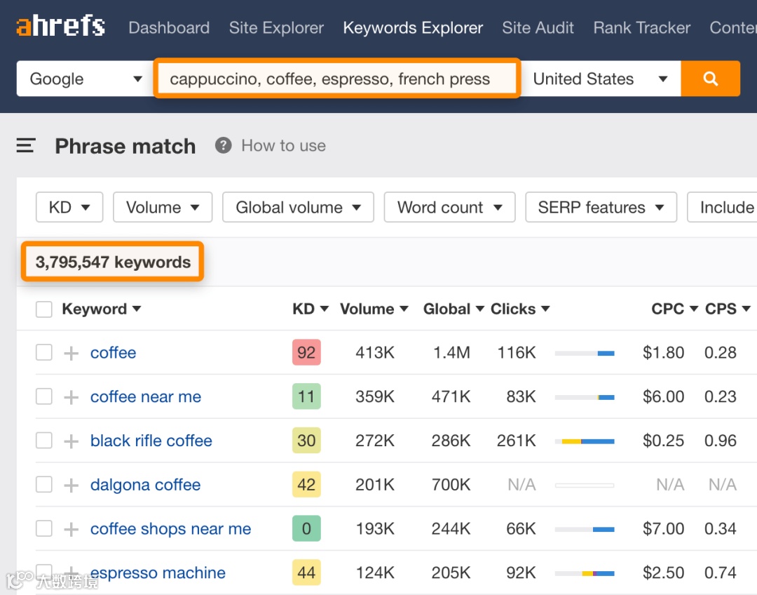 但是当你把 Coffee 输入到 Ahrefs 的 Keywords Explorer(关键词分析) 工具里,他会给你生成成千上万个包含 coffee 的关键词变体。如:how to make whipped coffee(怎么做起泡咖啡)coffee table dimensions(咖啡桌尺寸)