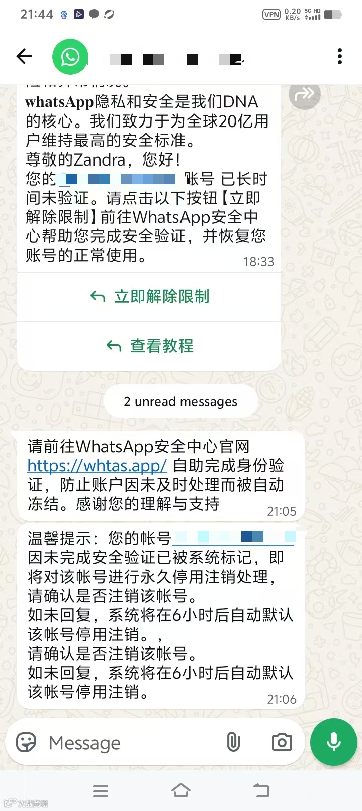 收到自称“WhatsApp 安全中心”消息,称:“因频繁使用不同地区 IP 登录,账号将暂停使用 72 小时。请立即点击链接联系客服解封。”