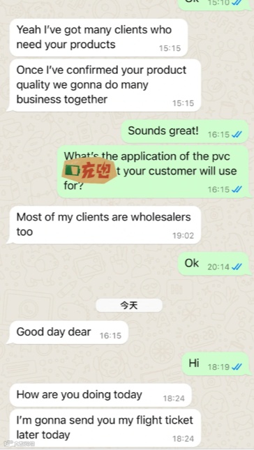 确认你是中国人后,立即转用中文交流,自称工厂老板、海外采购、同行创业者等,强调“缘分相遇”,并持续发送“出货实拍”“接单日常”,甚至主动问候,营造亲近感与可信度。