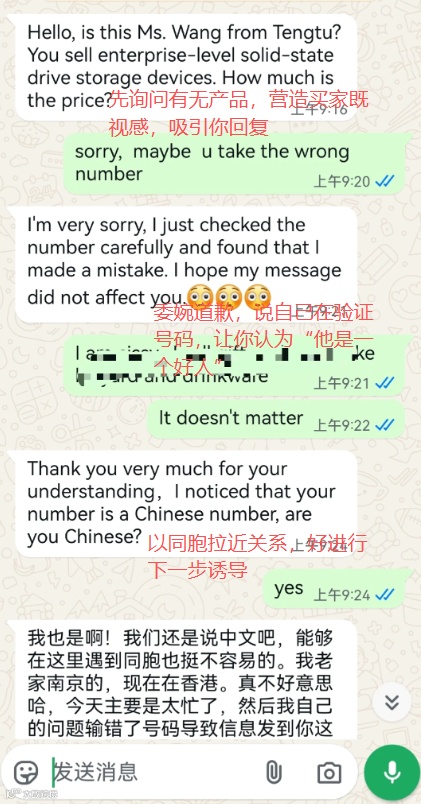 你是否遇到过这样的情况——在 WhatsApp 上,一位看似专业的联系人逐步与你讨论订单、分享商机,一切显得自然可信,直到某天话题悄然转向“投资机会”或“紧急周转”?