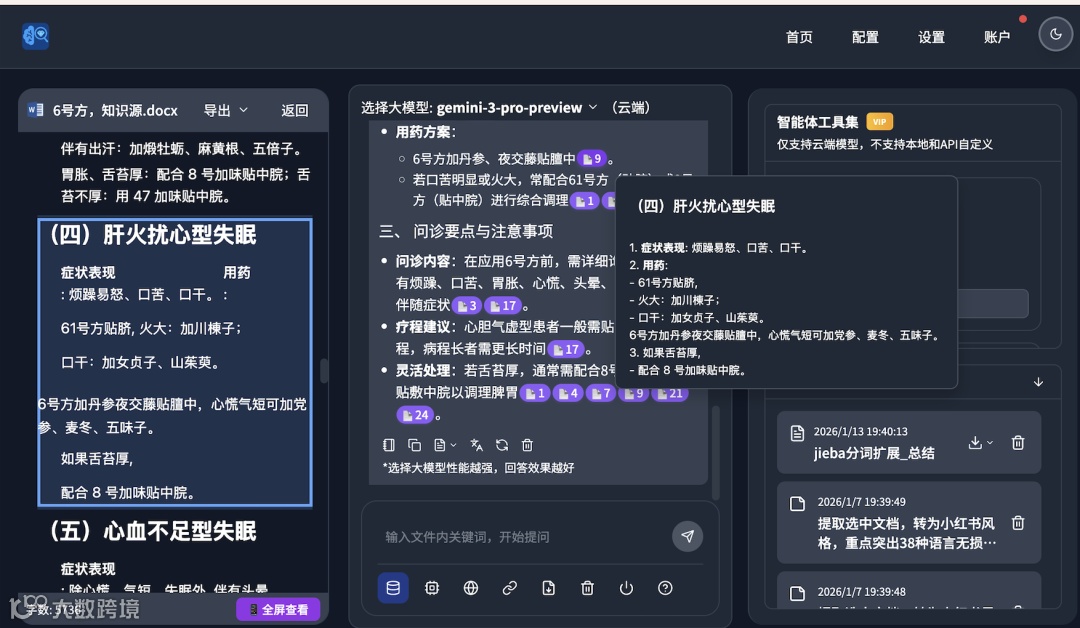 选择对应专业模式(如医学),输入问题(例如“6号方总结”),系统返回结构化答案,并在末尾标注紫色引用编号;点击编号可直达原文出处,高亮显示上下文。