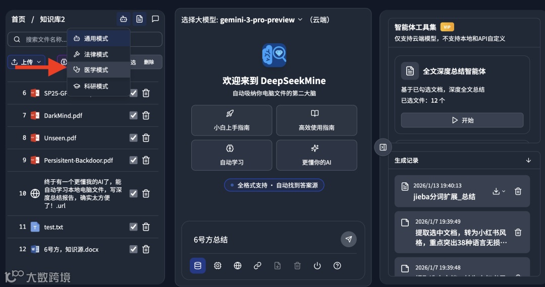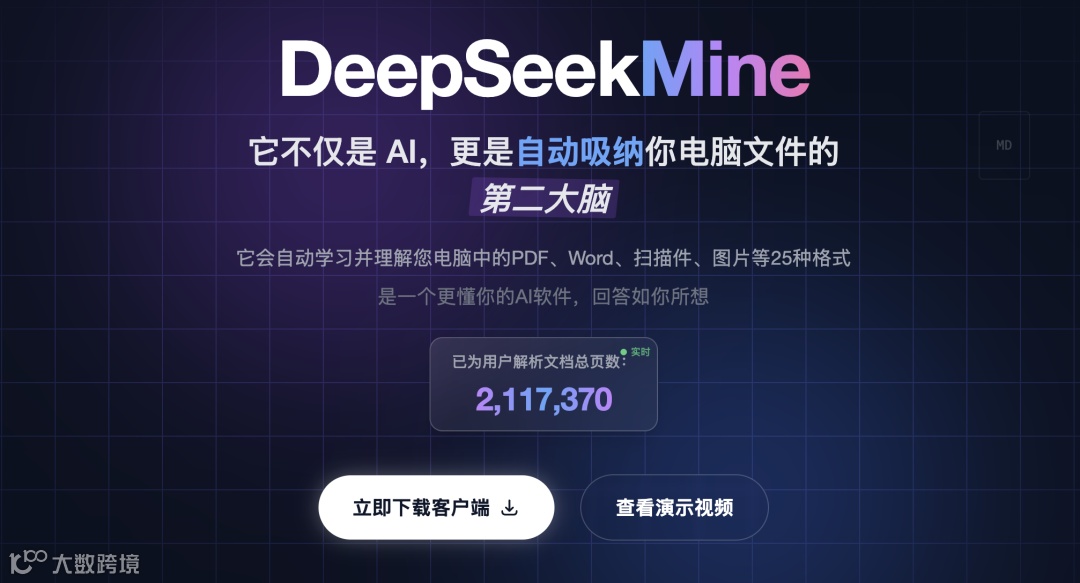 DeepSeekMine是一款支持本地与云端双模式运行的智能知识库工具。目前已为用户解析文件超210万页,兼容PDF、Word、Excel、扫描件、图片等多种格式,并实现自动识别、语义理解与结构化存储。