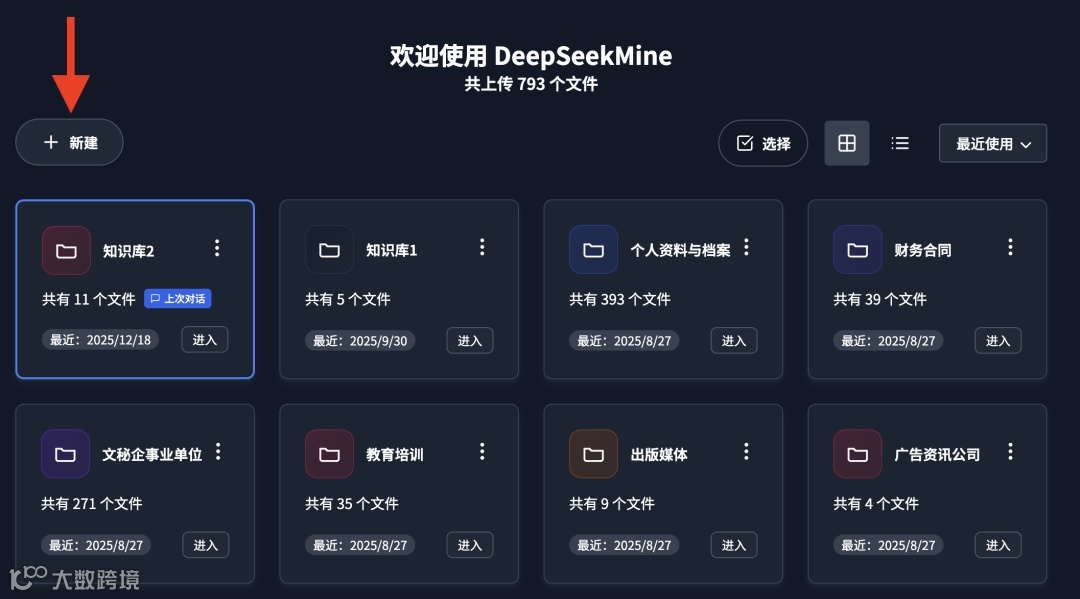 启动软件后,点击「新建」创建知识分类卡片,进入该知识域的文件管理与交互界面。