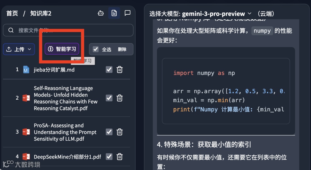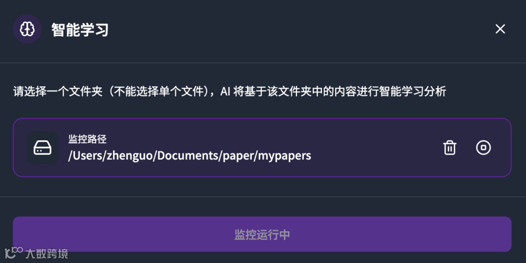 开启「智能学习」,绑定本地资料目录。此后新增文件将被自动扫描、解析并纳入知识库,真正实现“存即学”。