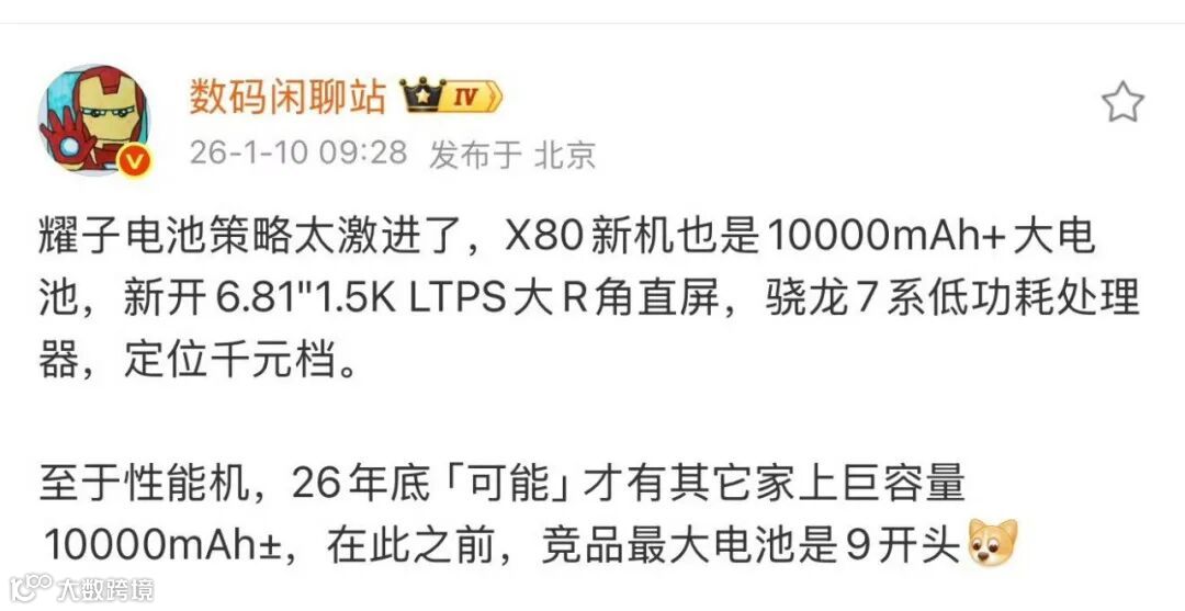 博主给出的详细爆料,今年友商旗舰机大电池最多也只是9000mAh+,10000mAh以及更大电池,最早量产上市也要到年底。