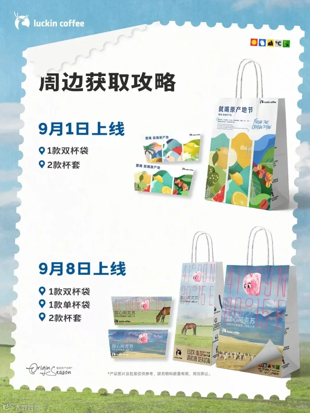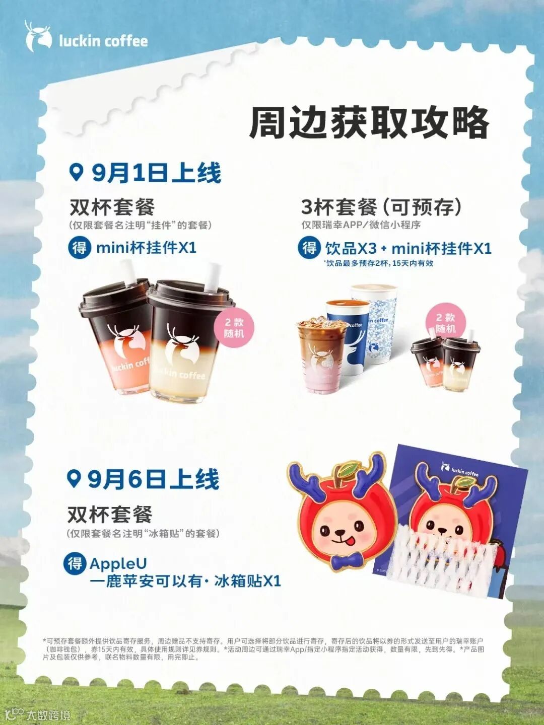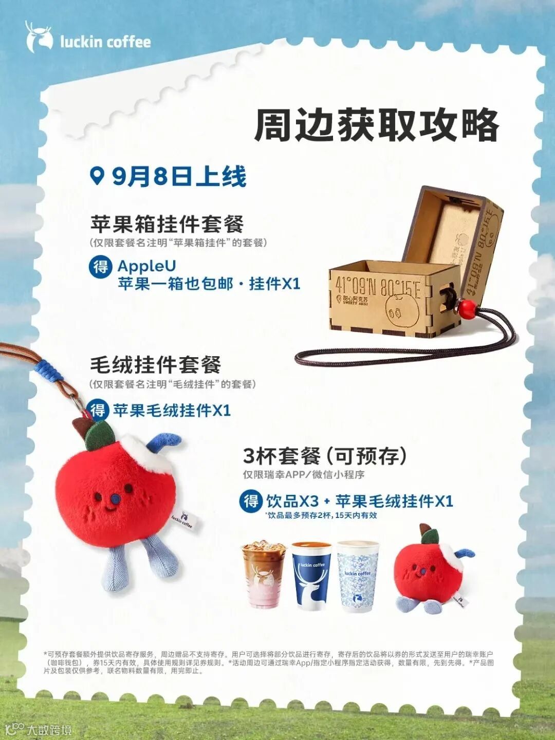 自9月1日起,瑞幸咖啡推出阿克苏苹果系列新品。9月6日上线双杯套餐,赠送mini杯挂件;9月8日推出苹果箱挂件套餐。消费者购买3杯套餐可获饮品及周边赠品,支持饮品预存(15天内最多预存2杯)。